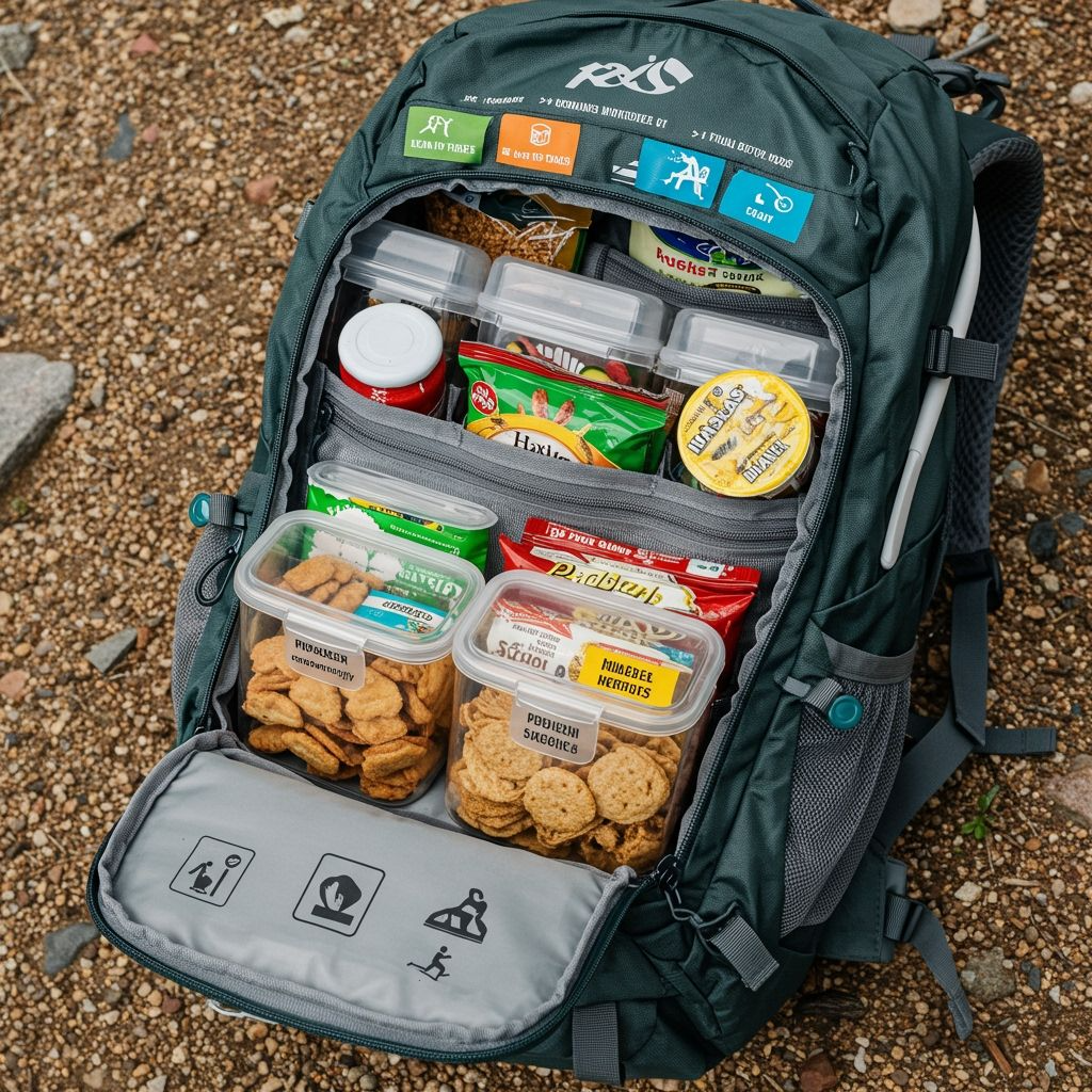 Accessibility organization keeps frequently needed snacks in easily reached pack locations while storing backup or emergency snacks in less accessible areas.