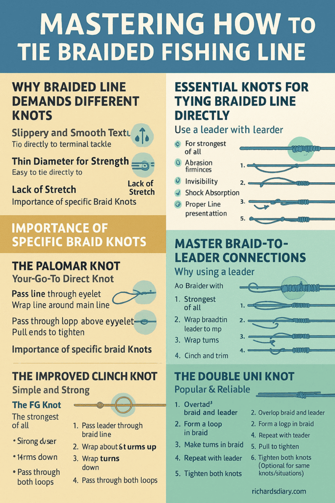 A1: Braided line is very slick and lacks the stretch of mono, causing common knots to slip. You need knots specifically designed for braid’s properties, like the Palomar (for terminal tackle) or the FG/Alberto/Double Uni (for leaders). Always moisten and cinch slowly.