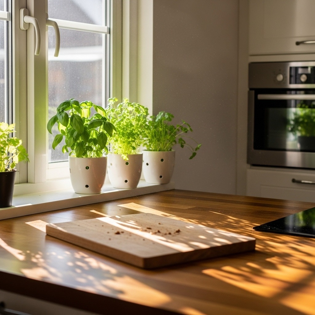 Use a watering spray mister to keep kitchen herbs happy without overwatering in small pots. Group herbs in odd numbers even here—three to five varieties look intentional rather than random.