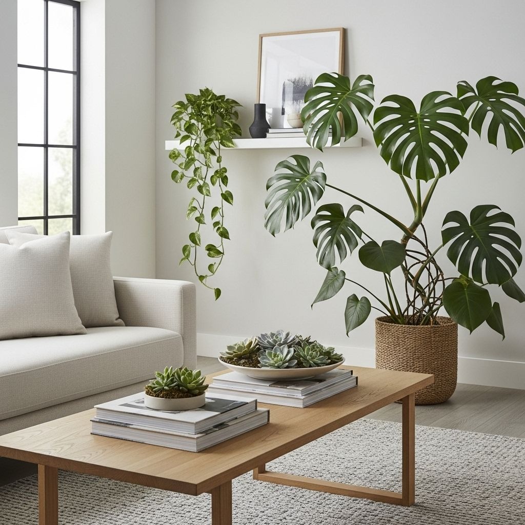I group three plants on my coffee table—a small succulent arrangement, a compact fern, and a trailing Pothos in varied heights using books as risers. This creates an interesting vignette without overwhelming the table’s function.