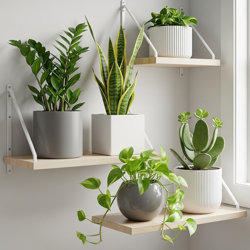 Snake plants and ZZ plants thrive in low-light conditions while maintaining strong aesthetic appeal. Snake plants offer vertical, sculptural forms with striking leaf patterns that create bold statements in dim corners. ZZ plants produce glossy, architectural foliage that stays attractive even with minimal light. Pothos also tolerates low light reasonably well, though growth slows compared to brighter locations. If your space truly lacks natural light, consider supplementing with indoor plant LED grow lights positioned to look like intentional lighting fixtures rather than obvious plant equipment.