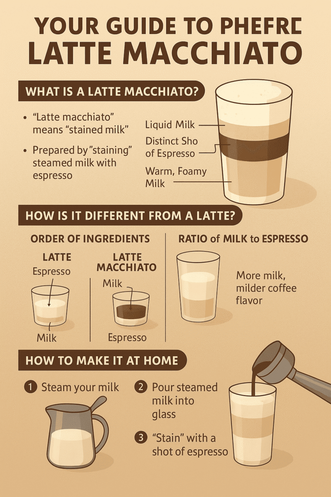 A good latte macchiato uses a significant amount of light, airy foam, which helps create that distinct top layer. The espresso is gently poured through it. In contrast, a traditional latte has a thinner layer of microfoam, which is integrated into the drink. For more details on other popular milk-based coffee drinks, you can learn about what is a latte coffee and its characteristics.