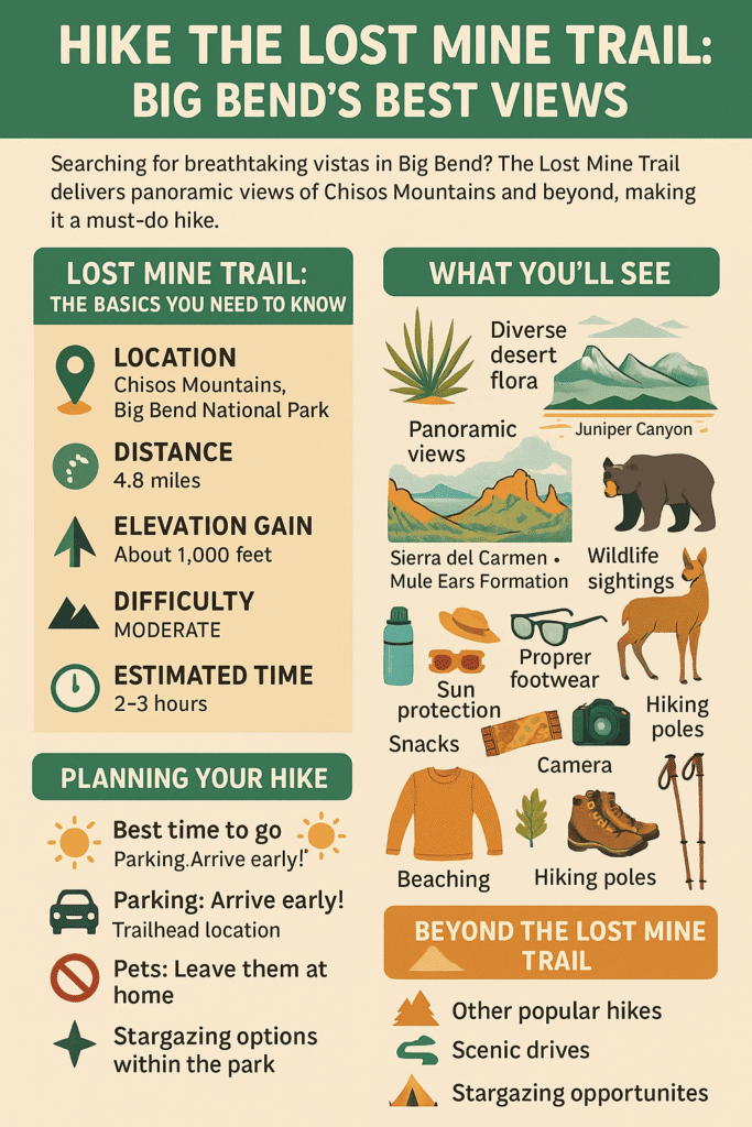 The Lost Mine Trail offers an unforgettable experience in Big Bend National Park, blending moderate effort with spectacular rewards. With the right preparation and knowledge, you’re set for an amazing adventure that showcases the wild, rugged beauty of West Texas. Happy hiking!
