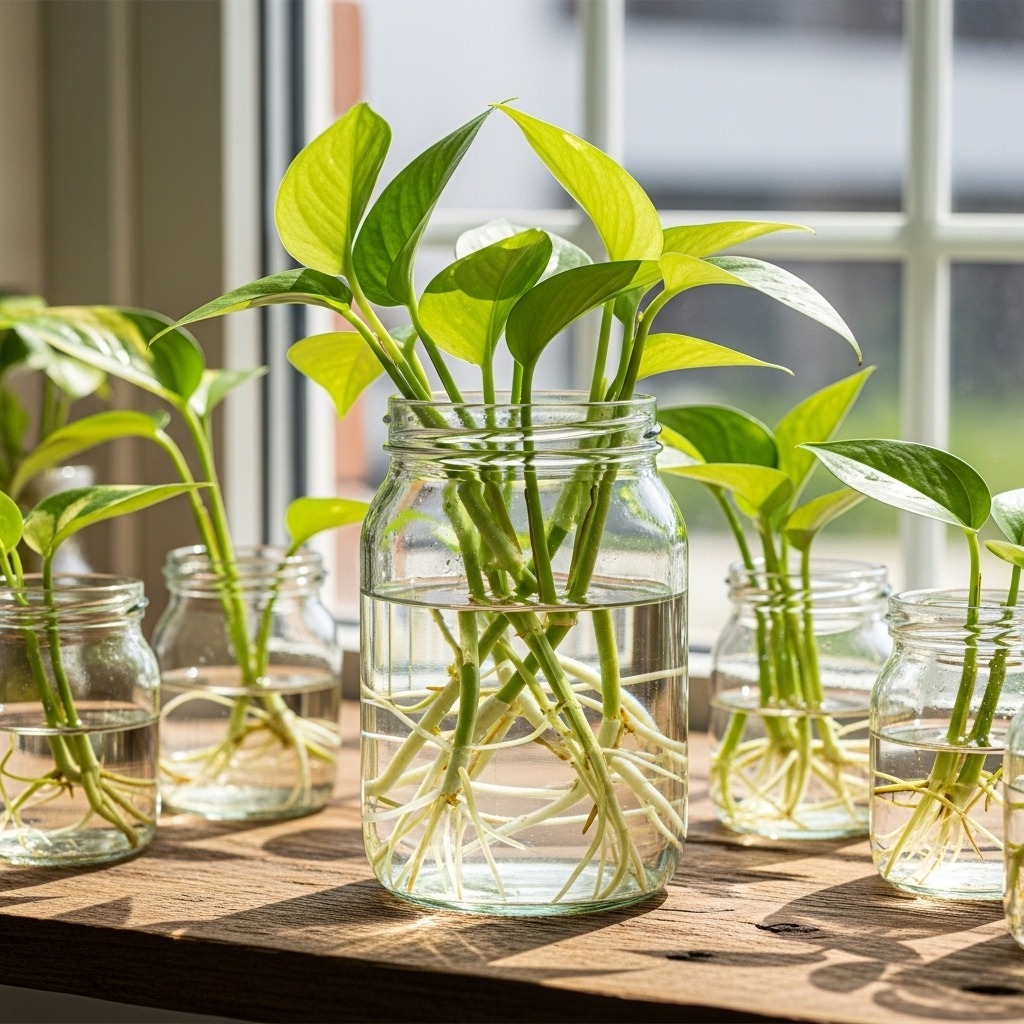 Water propagation (pothos, philodendron, spider plant babies):