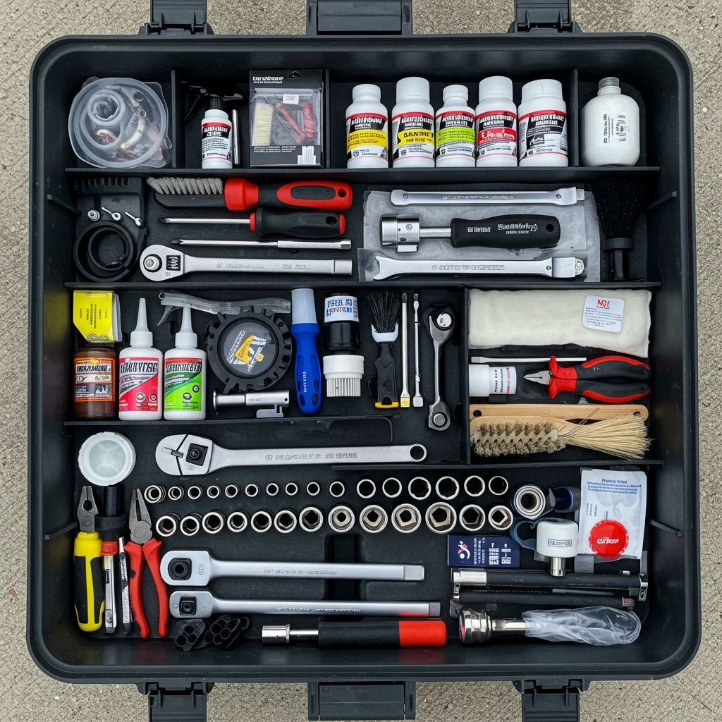 A: Basic tools, extra fuses, light bulbs, sealants, a tire pressure gauge, and cleaning supplies handle most common issues. The specific items depend on your RV type and systems, so consult your owner’s manual.