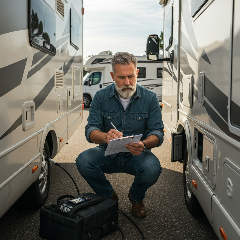 Mechanical systems require checking tire pressure, fluid levels, brake operation, and hitch connections for towable RVs. Ensure all safety chains and electrical connections are secure.