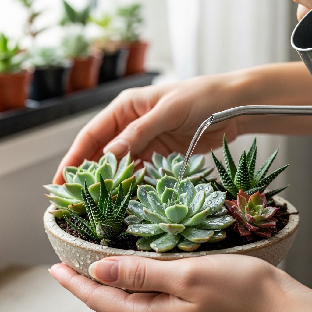 Group multiple succulents in shallow dishes or decorative ceramic plant pots for desktop gardens.