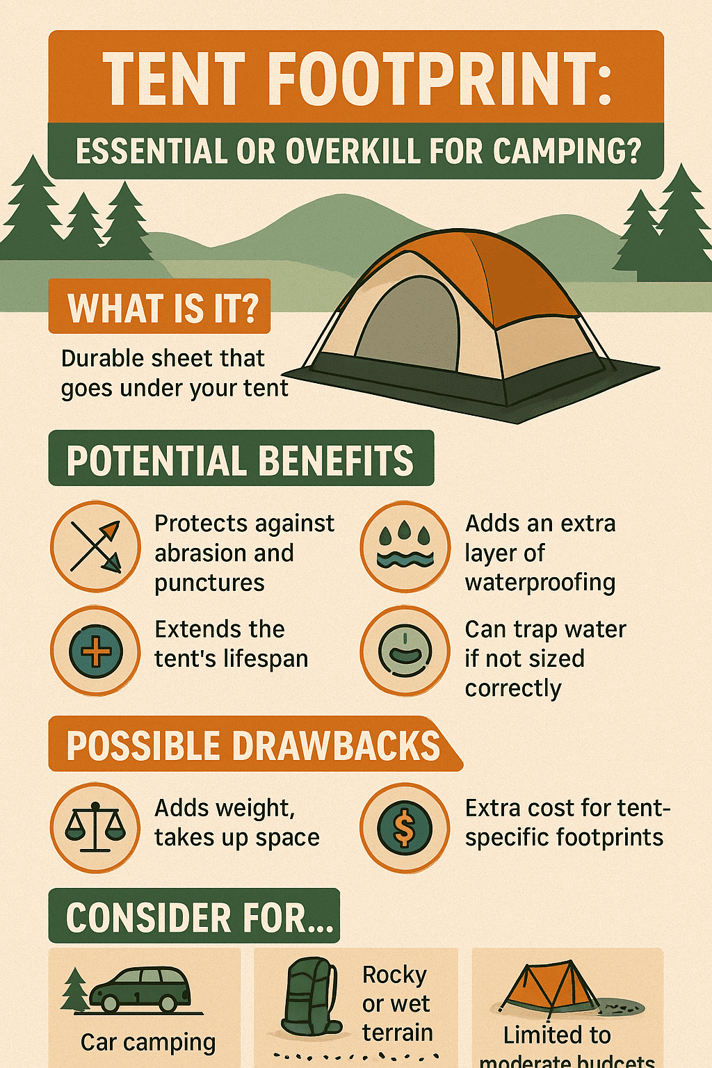 - Tent Floor Material: If your tent has a very thin, lightweight floor fabric (common in ultralight tents), a footprint becomes much more critical for protection. A thicker, more robust tent floor might not need it as much.