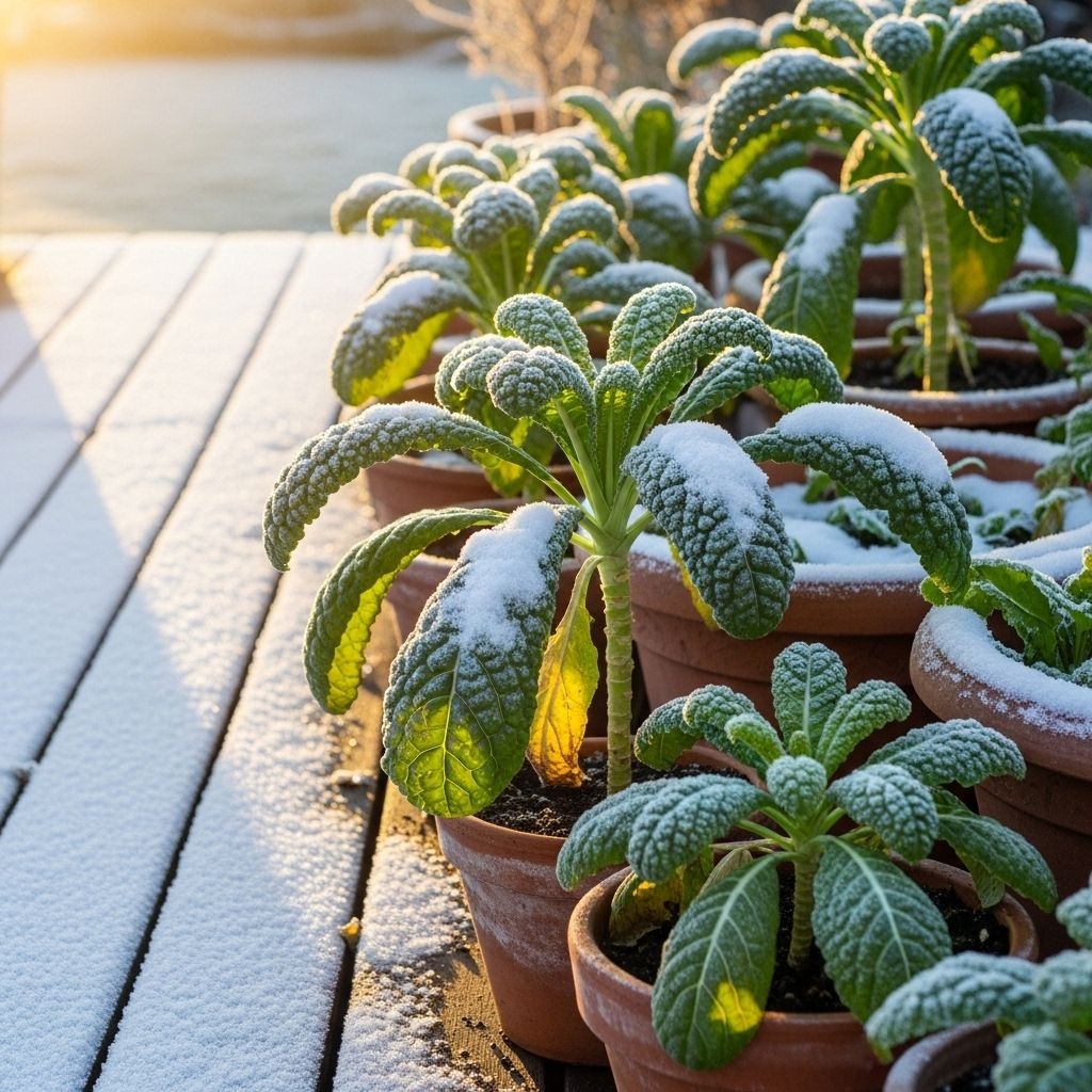 Kale tops my list every single time. This superfood vegetable actually becomes sweeter after several hard frosts. I grow both standard curly kale and flowering varieties in 8-inch pots, and they produce continuously from fall through early spring. The flowering types look absolutely stunning with their creamy white or purple centers—almost too pretty to eat, but I harvest them anyway because they taste incredible. Varieties like ‘Winterbor’ and ‘Red Russian’ are specifically bred for cold tolerance and can survive temperatures well below 20°F.